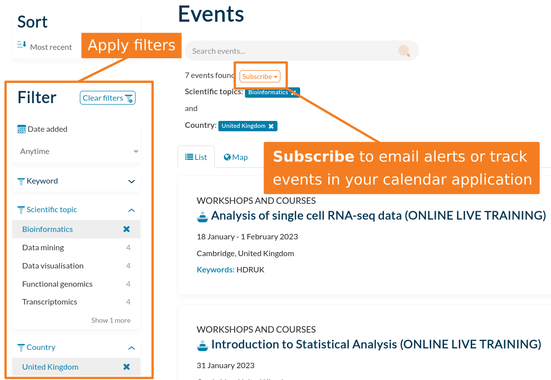 PaN-Training also provides a subscription feature to help users to stay informed about courses, workshops and conferences of interest to them. The service may be customised by selecting the relevant filters, and initiated via the subscribe button. Users may choose to receive email notifications about upcoming events, or have them automatically added to their preferred calendar application.